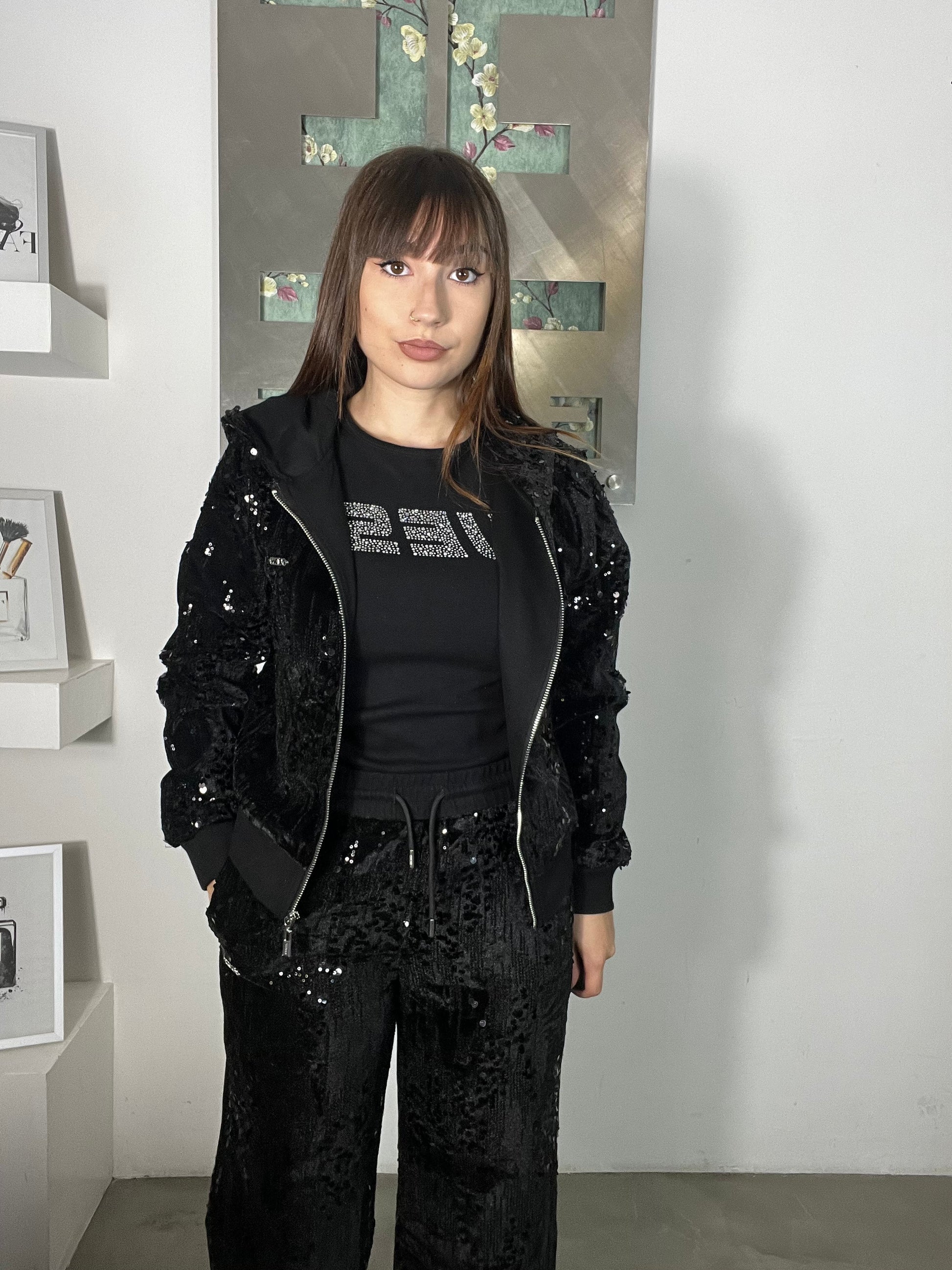 Pantalone sportivo dritto in velluto con applicazioni paillettes