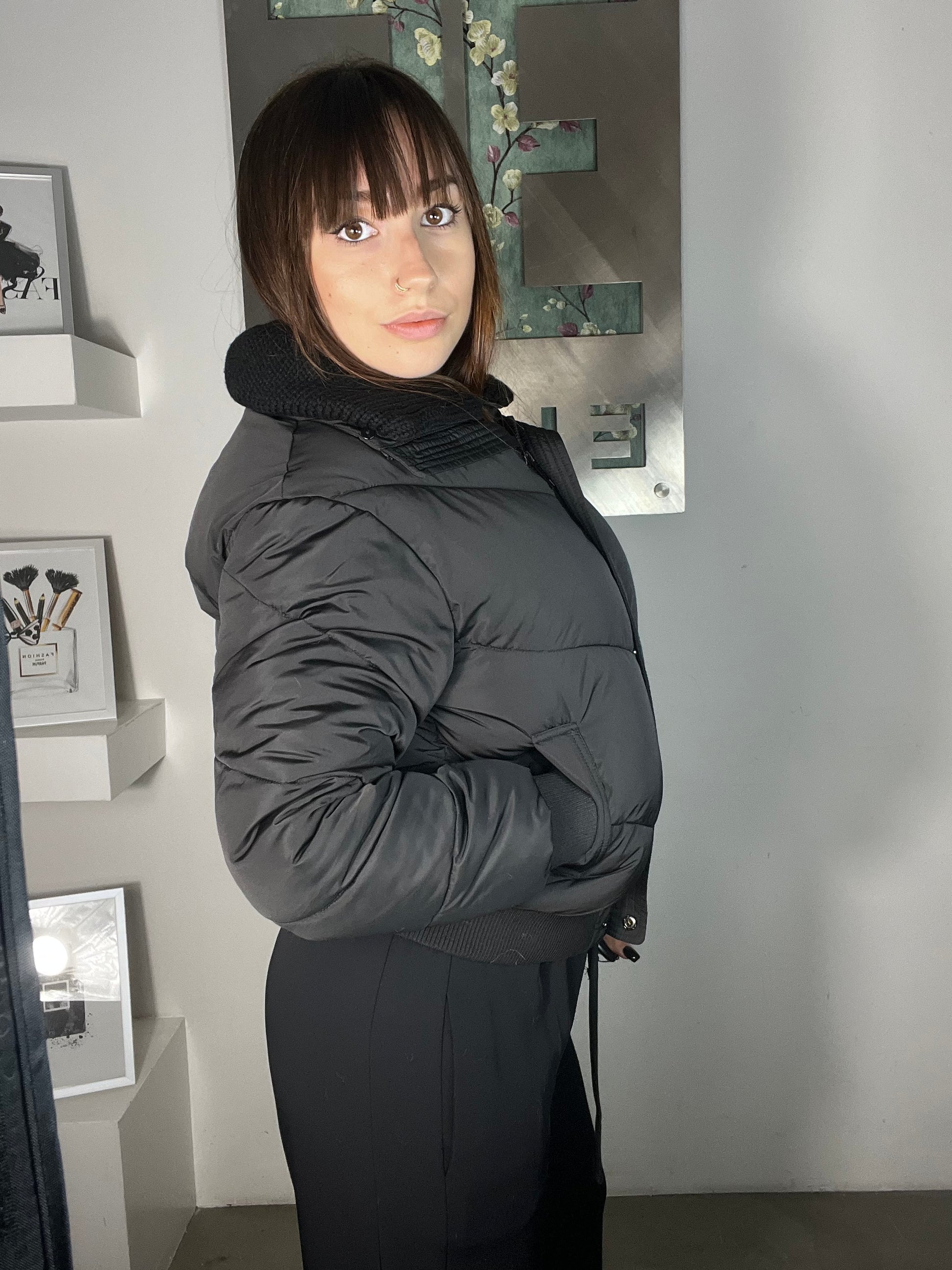 Piumino sintetico corto dal desing moderno e versatile. Il colletto è impreziosito da un inserto in maglia costine, rimovibile, che permette di personalizzare il look in base all'occasione. Dotato di pratiche tasche laterali, è un apo caldo e funzionale con un tocco fashion.