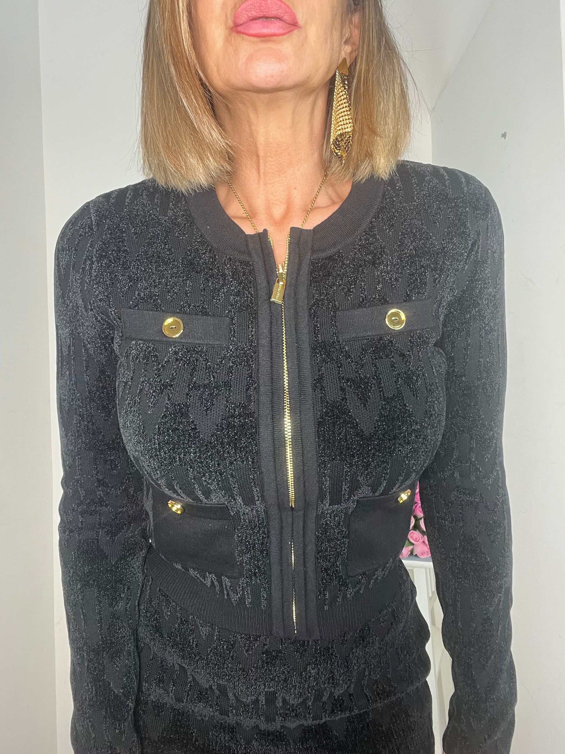 La chiusura con cerniera, il logo in riievo e le taschine sul fondo arricchite di bottoni dorati aggiungono un tocco distintivo e raffinato.