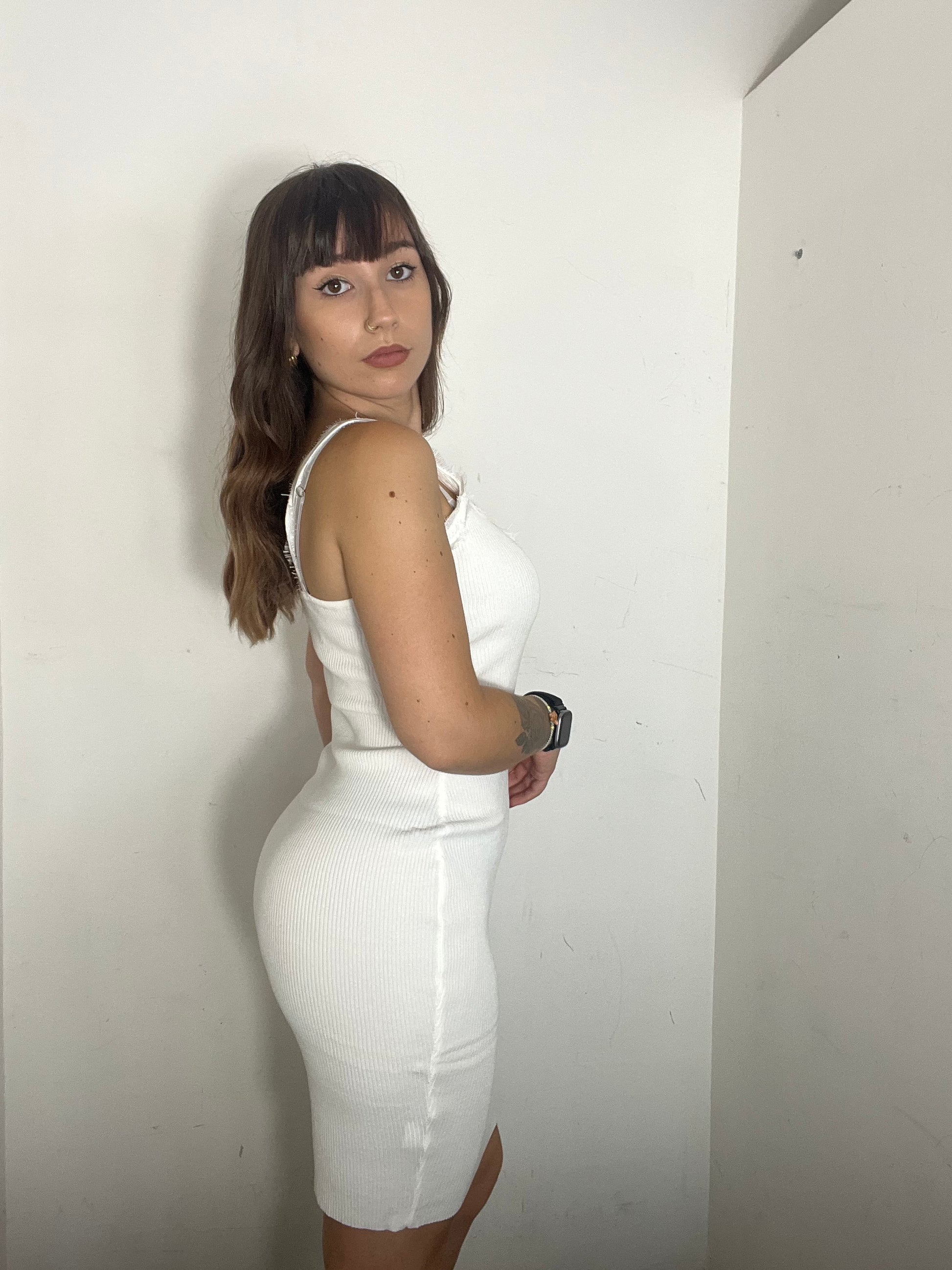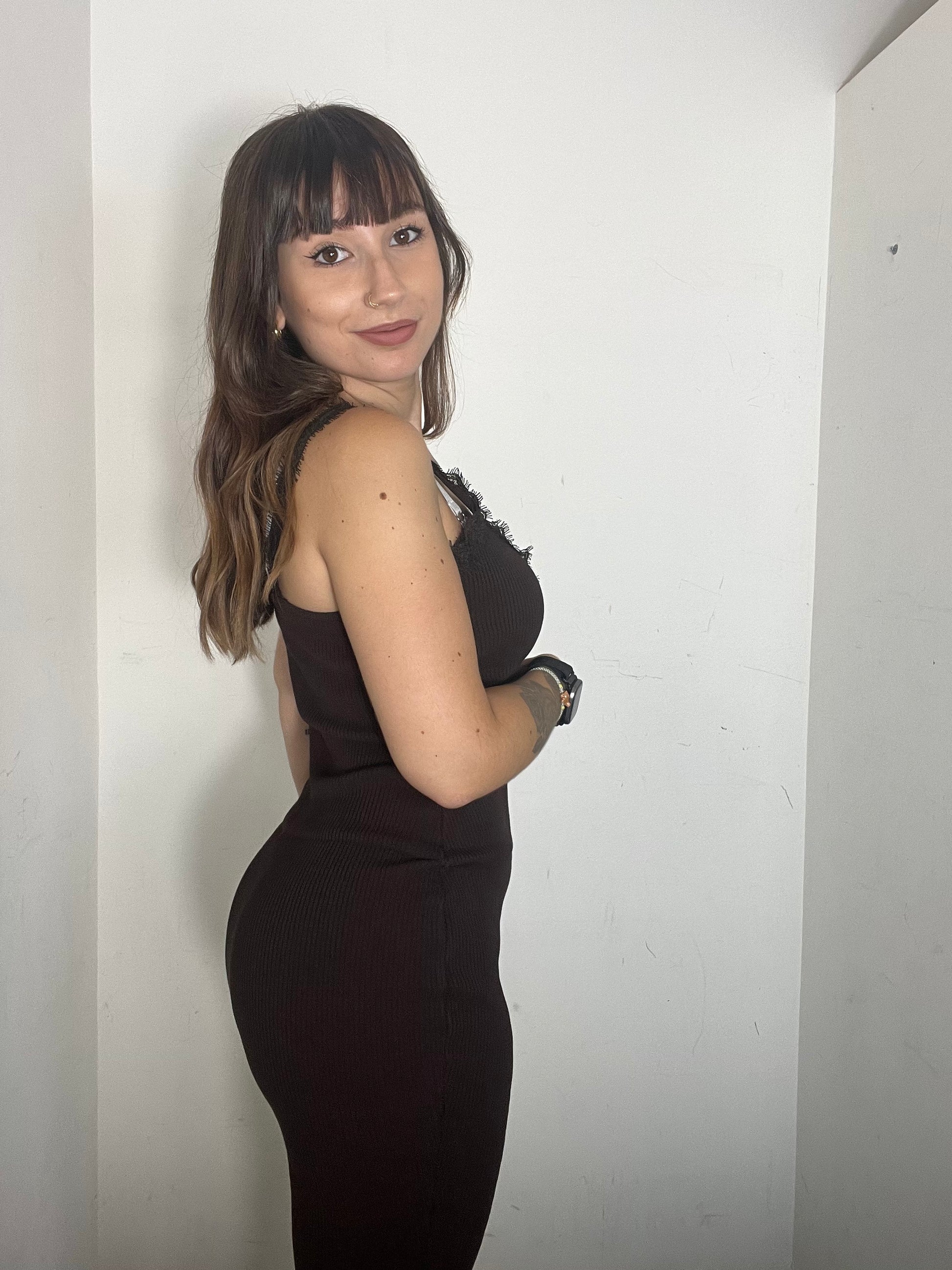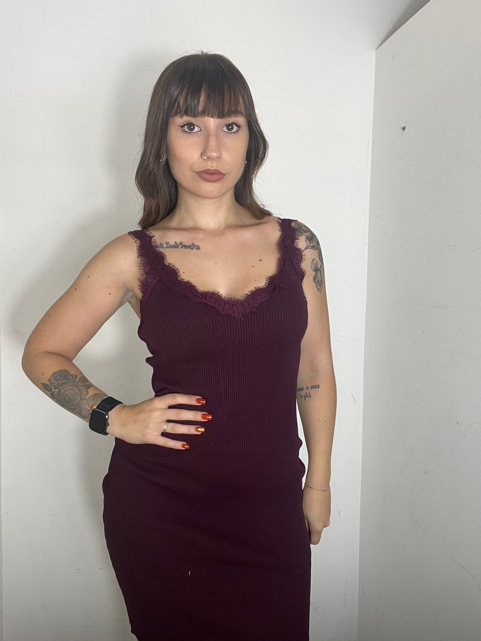 Abito Maglia Flora elasticizzato a costine che segue armoniosamente la silhouette, valorizzando le forme con eleganza e comfort. le sottili spalline sono impreziosite da un raffinato inserto in pizzo che aggiunge un tocco romantico e femminile. Perfetto si per look quotidiani, sia per la sera abbianato a sandali, decollete ed accessori luminosi.