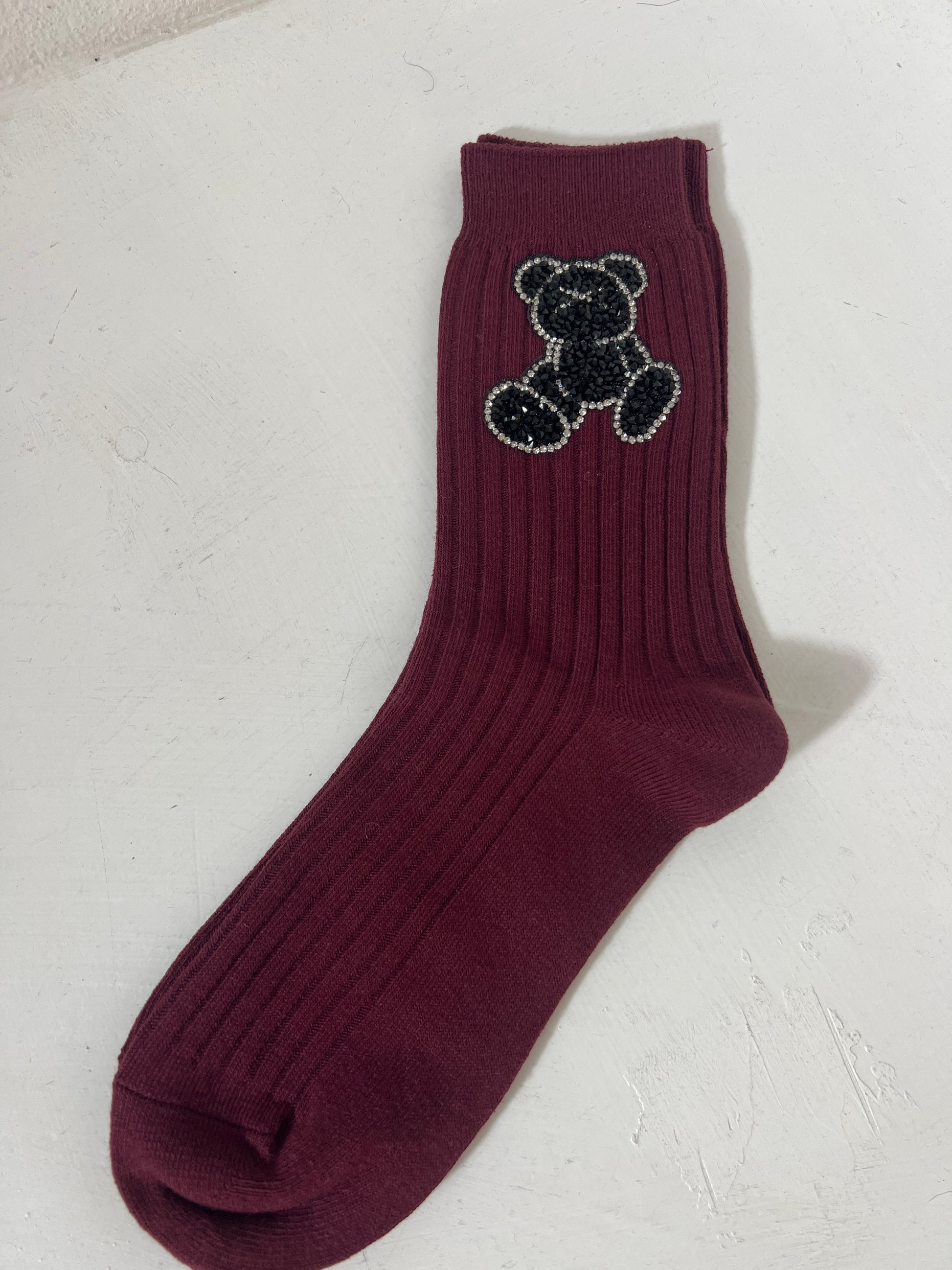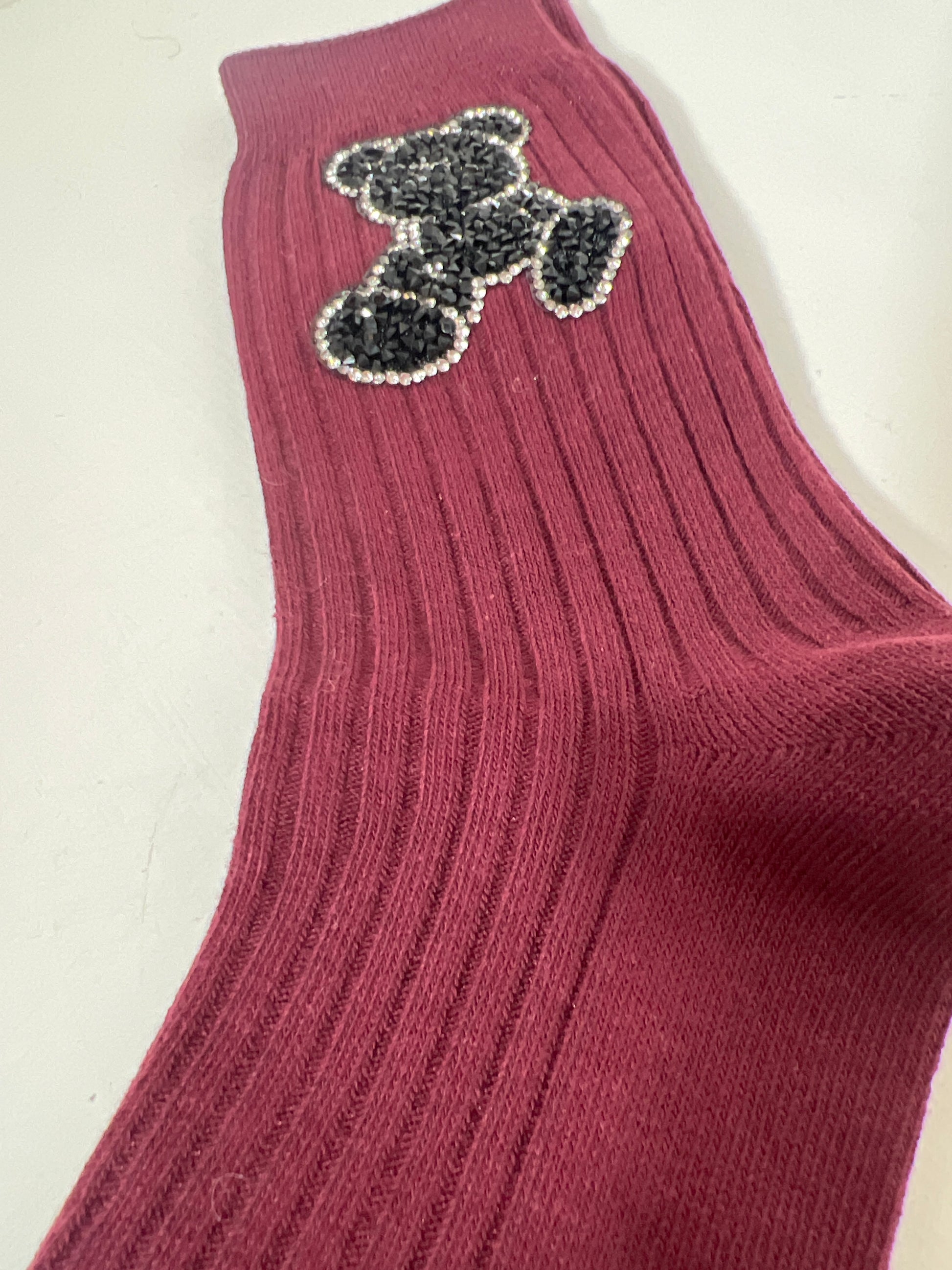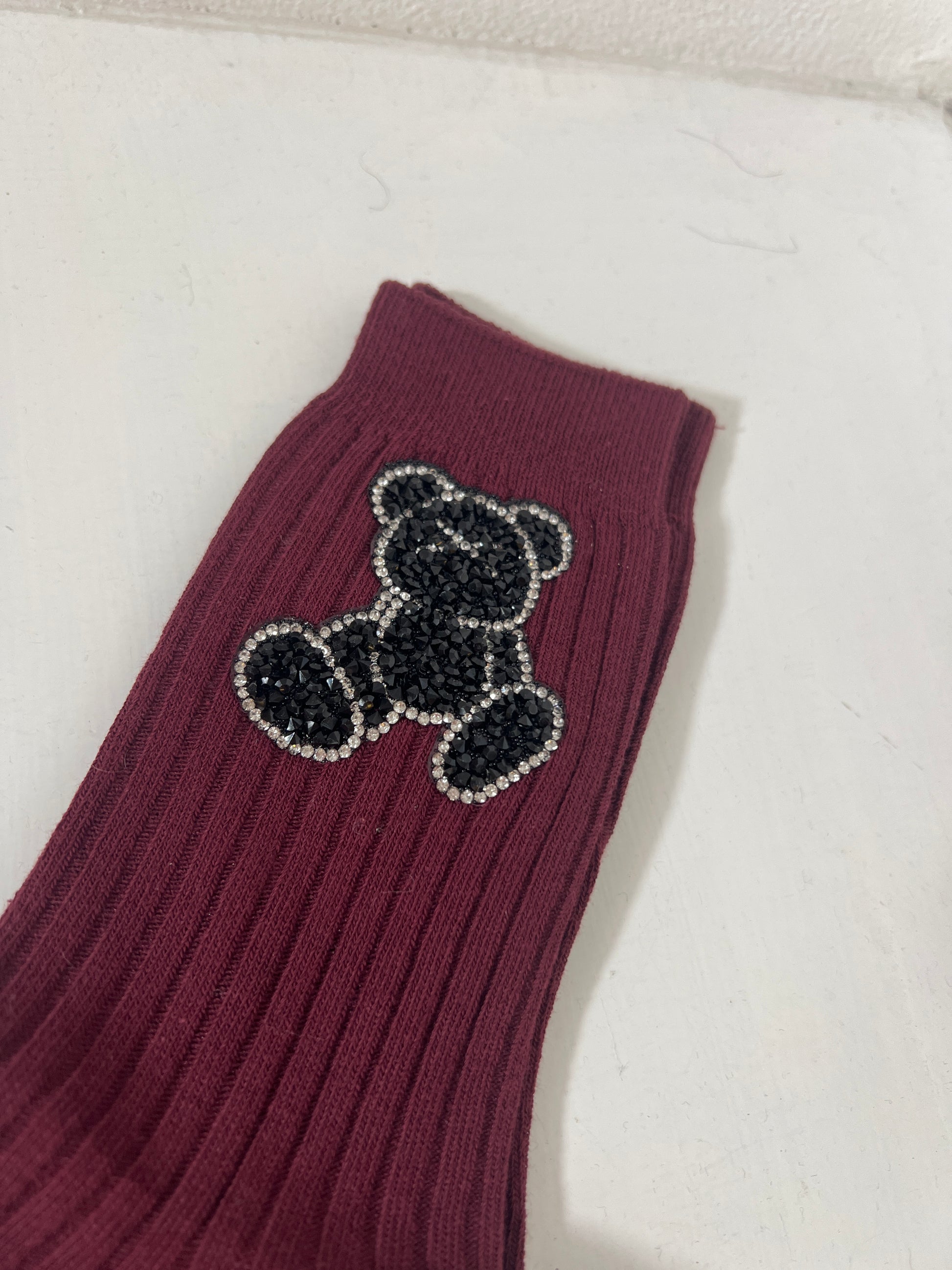 Calze divertenti con applicazione di patch Teddy con cristalli. Ideale per tutti i look, bellissima anche con il decollete.