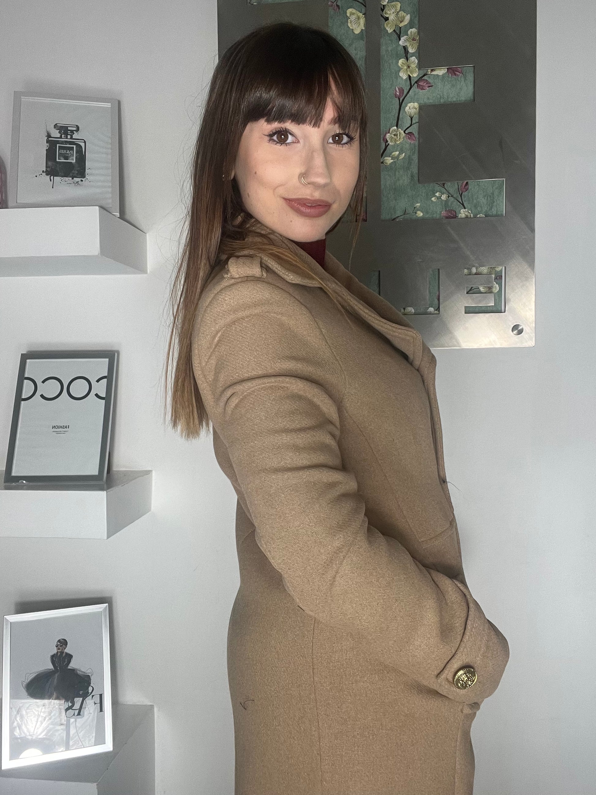I bottoni dorati illuminano la silhouette asciutta, esaltando la femminilità con un tocco di carattere e classe.