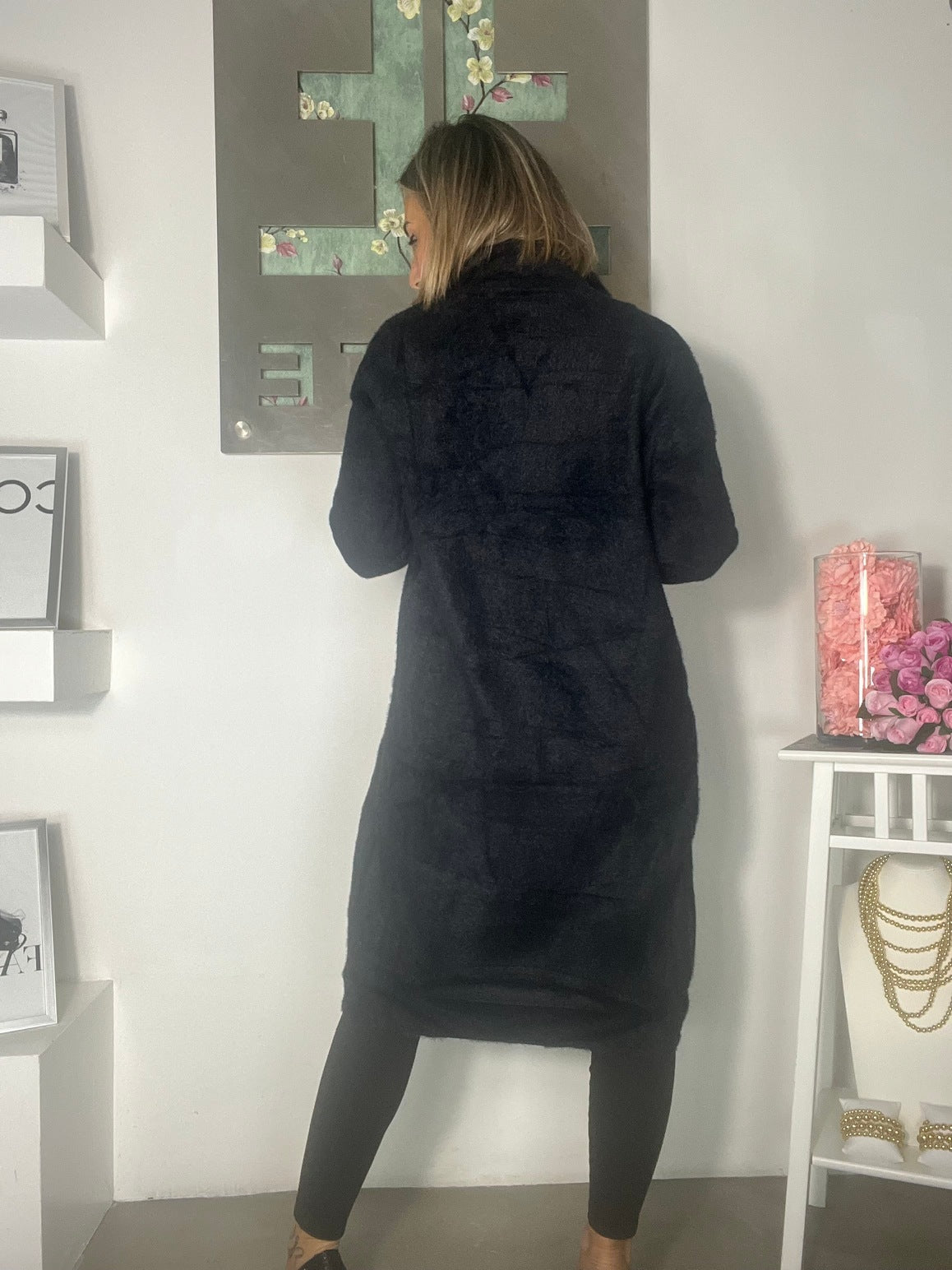 Un cardigan lungo che avvolge con grazia e grinta, morbido e femminile, chiuso da un bottone invisibile.
