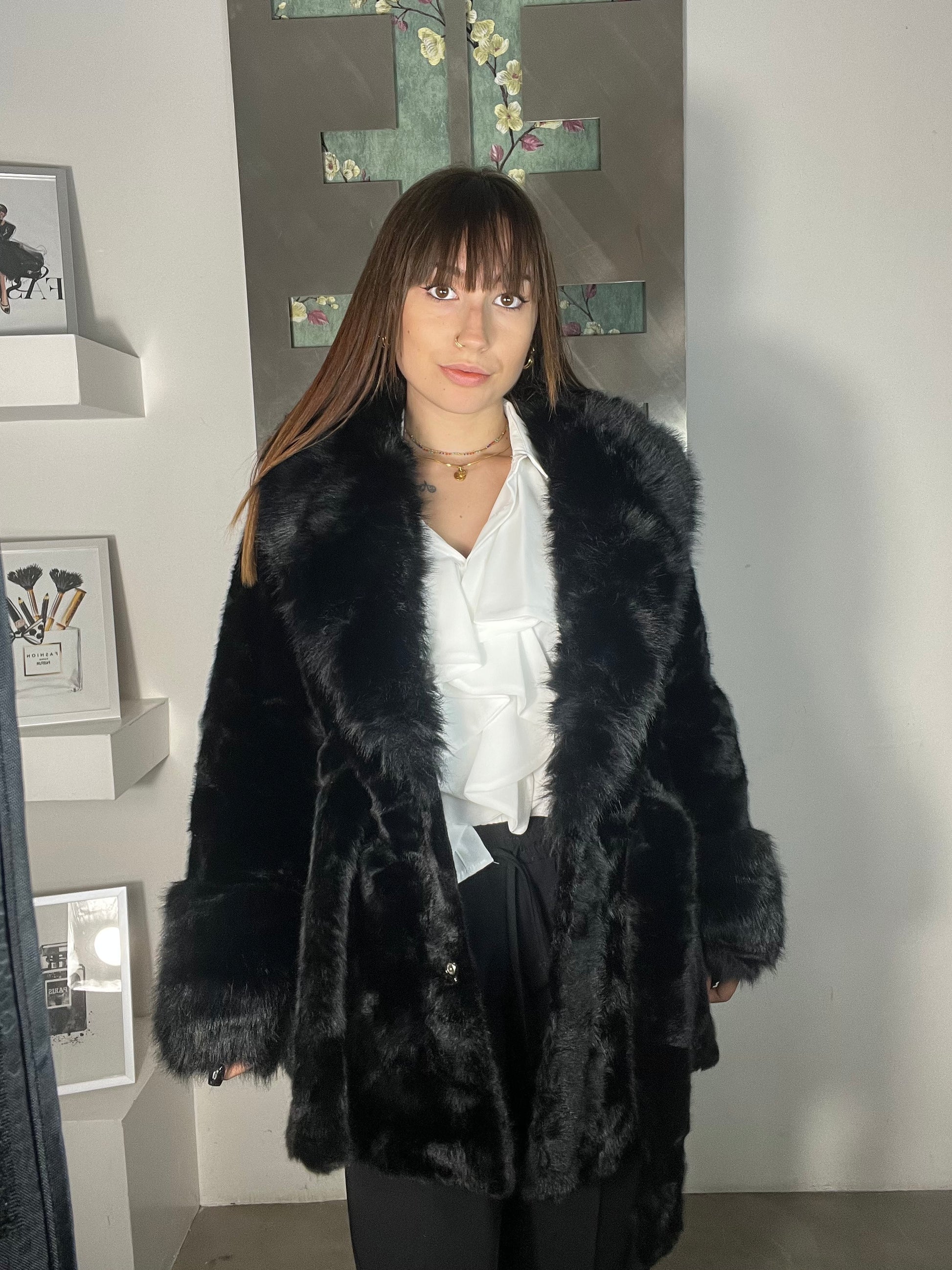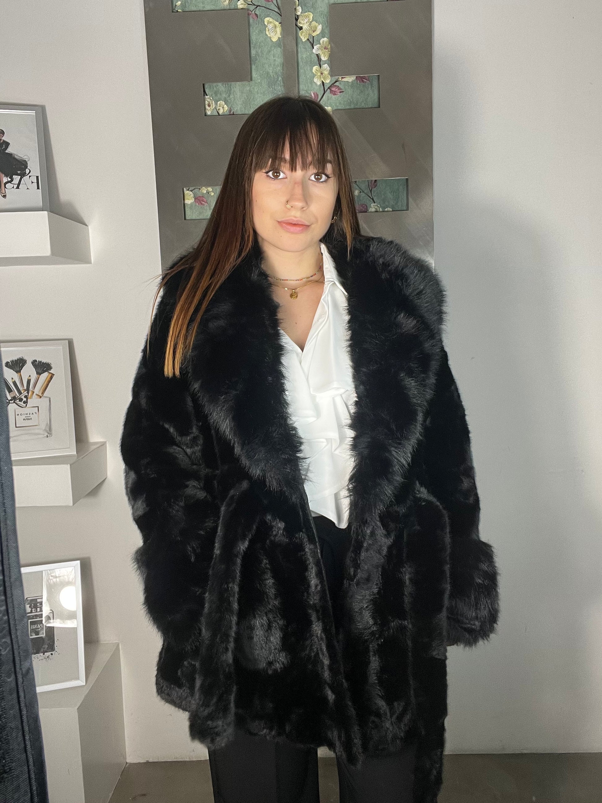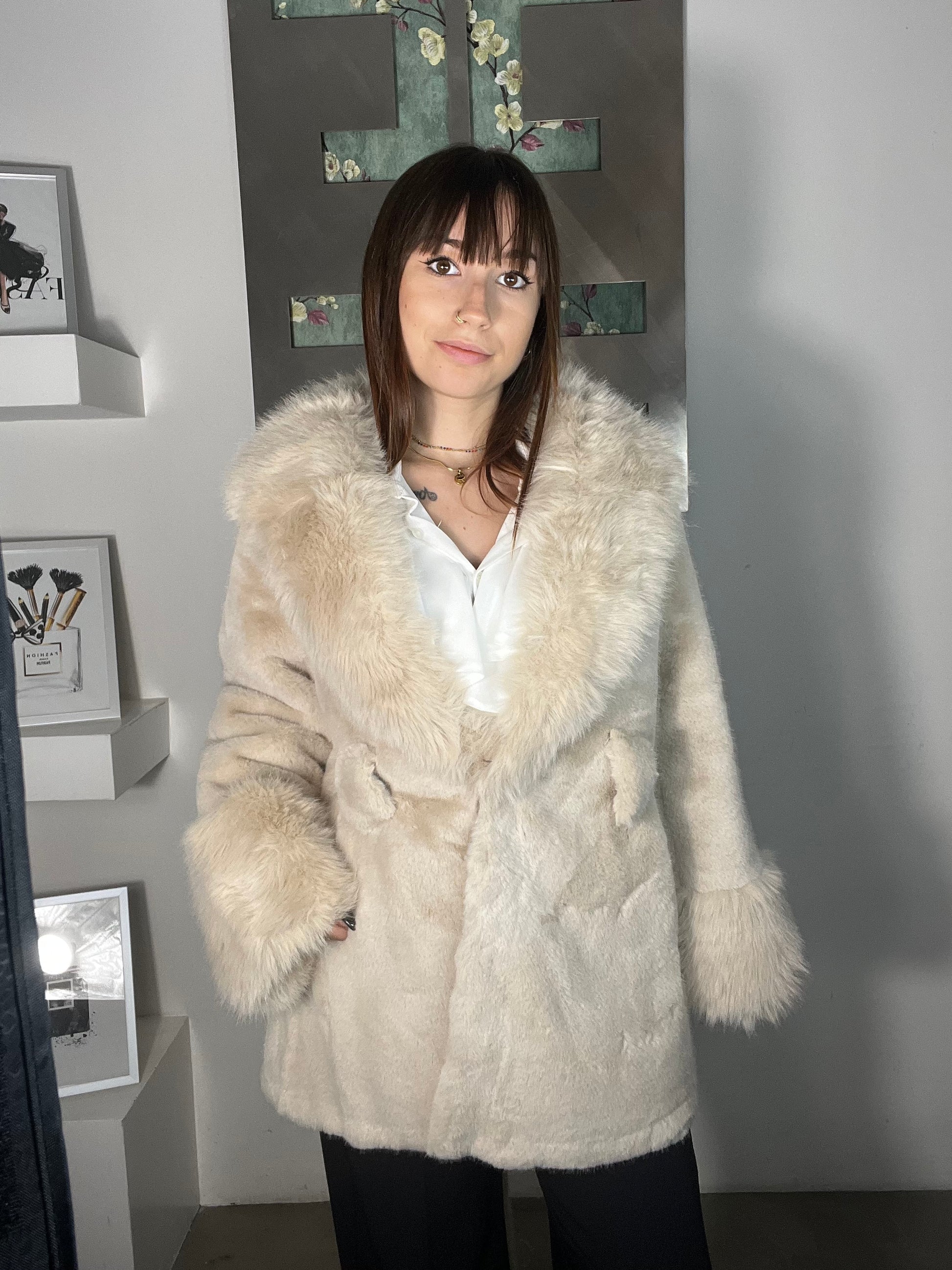 Ecopelliccia Franci ecopelliccia rasata con collo e polsini vaporosi lunghezza sotto il bacino con cintura