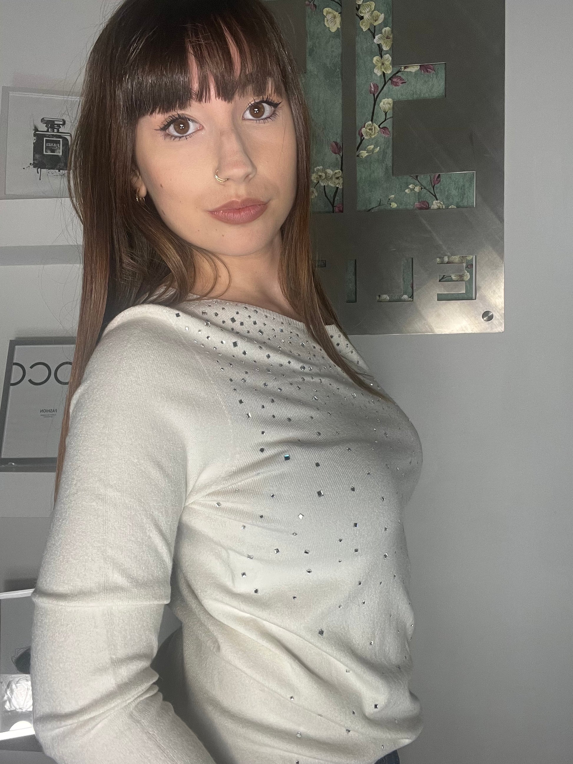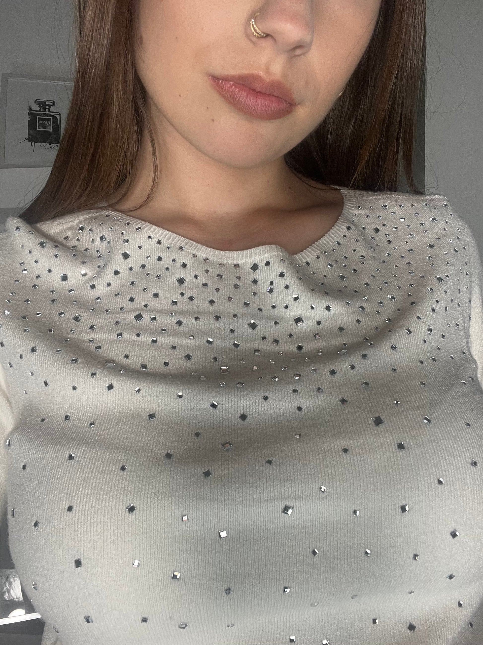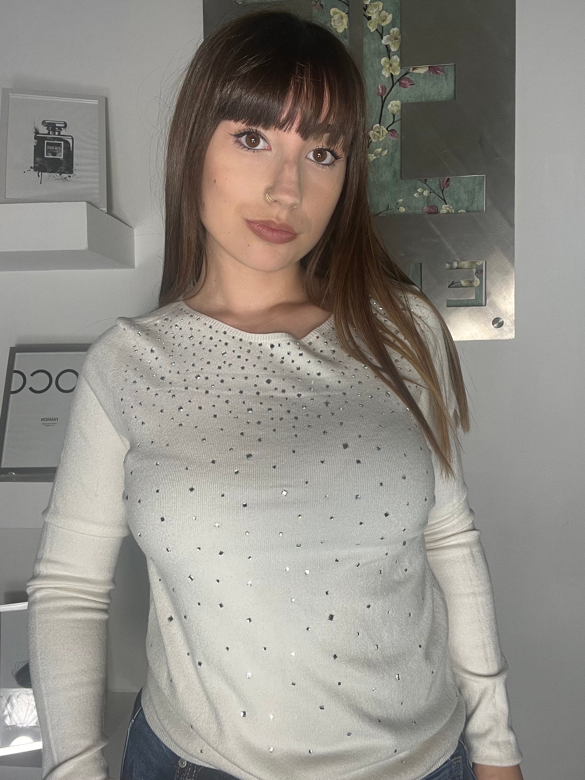La maglia rasata avvolge con leggerezza, mentre i brillantini sul davanti catturano la luce ad ogni movimento, regalando un tocco di brillante eleganza al tuo look quotidiano.