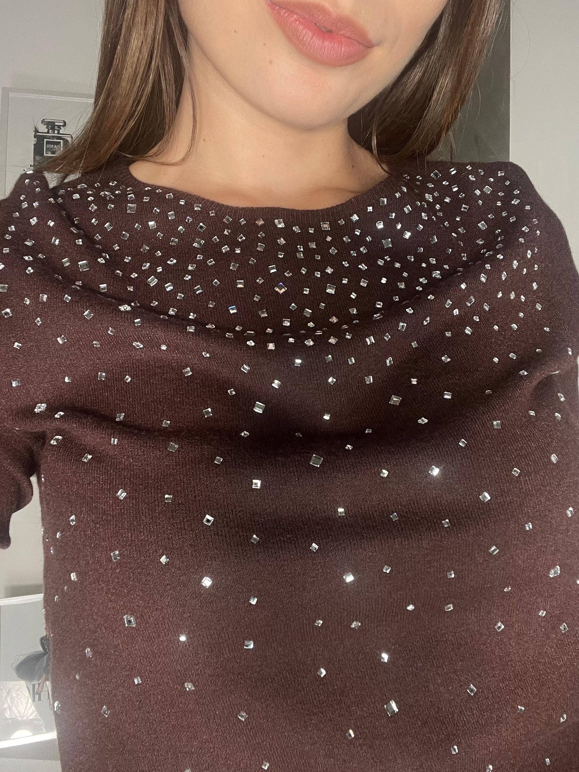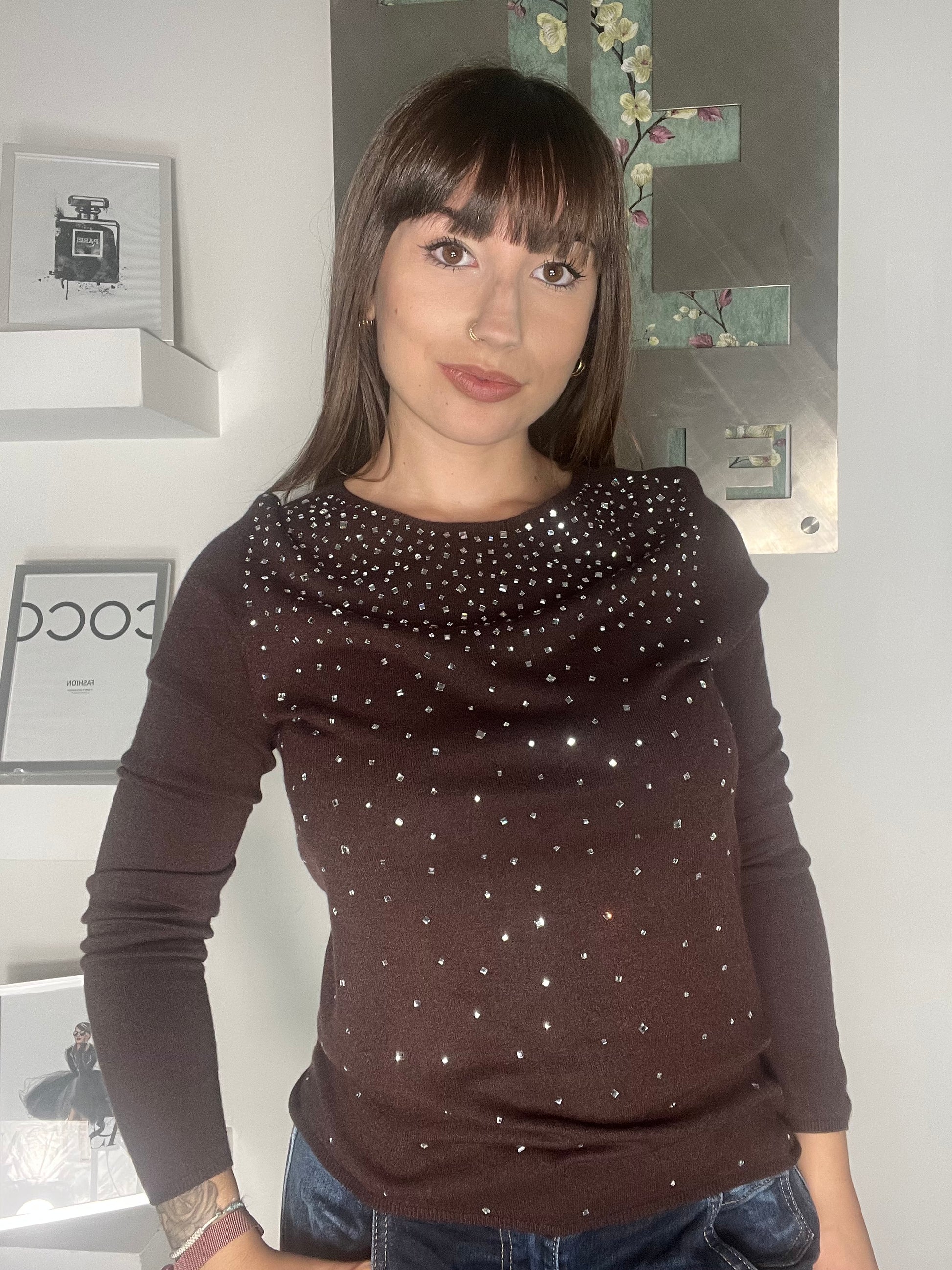 La maglia rasata avvolge con leggerezza, mentre i brillantini sul davanti catturano la luce ad ogni movimento, regalando un tocco di brillnte eleganza al tuo look quotidiano.