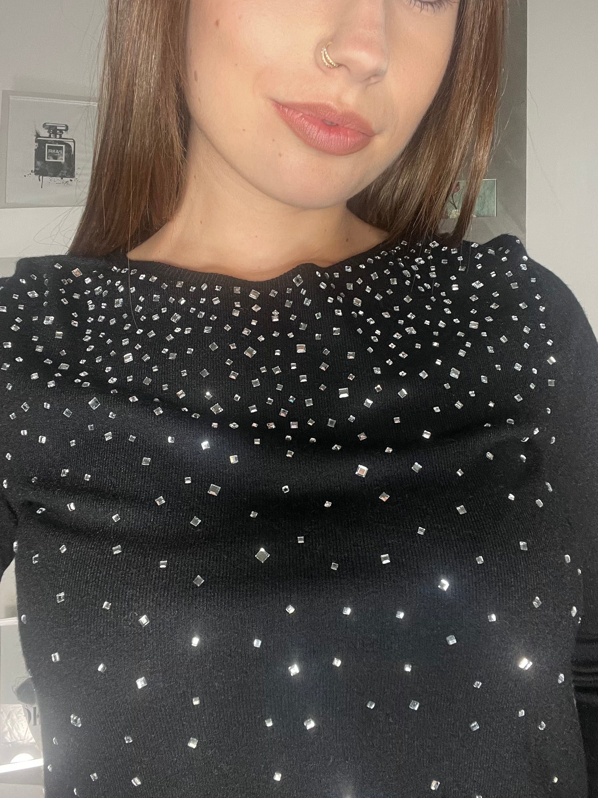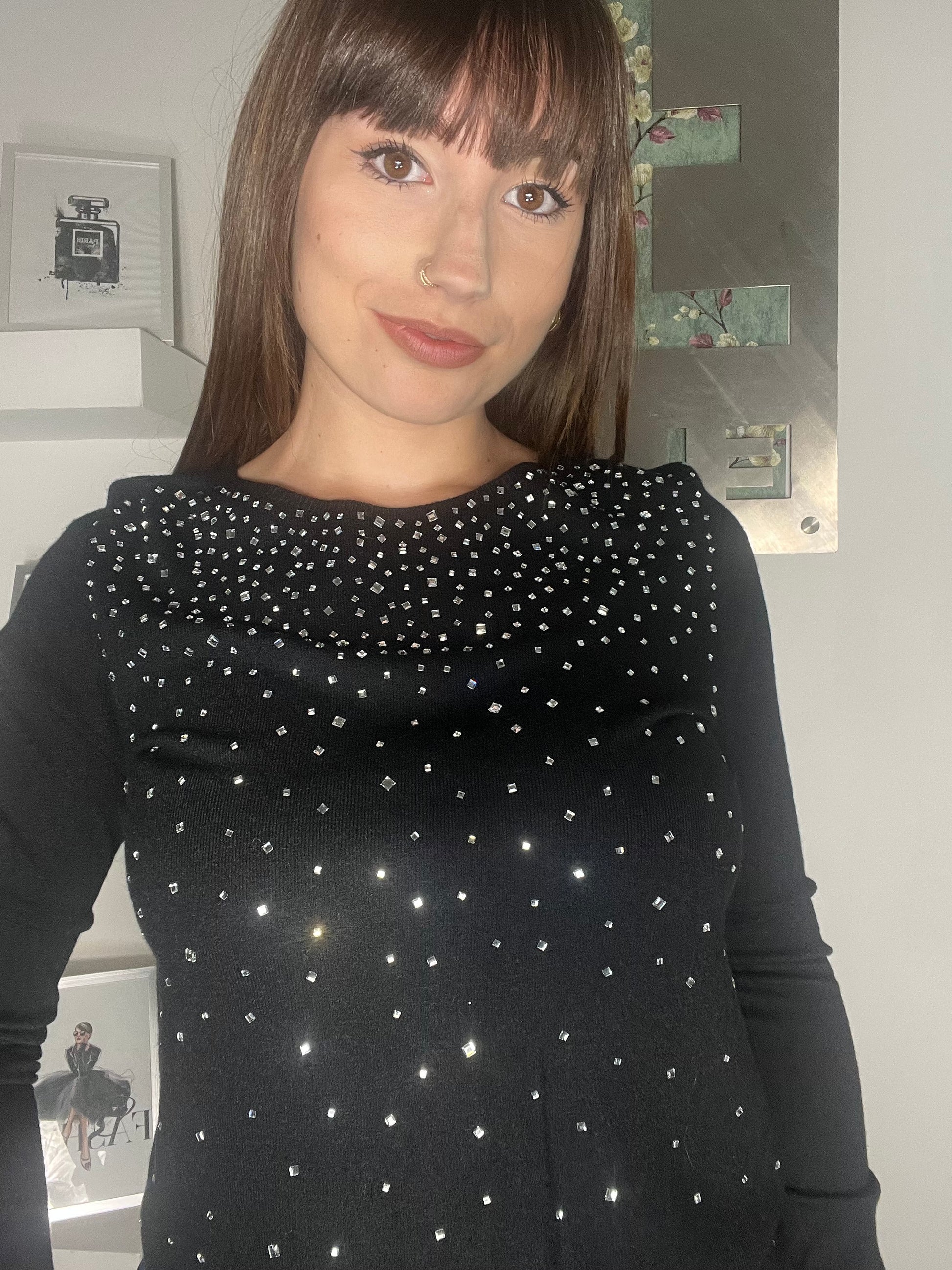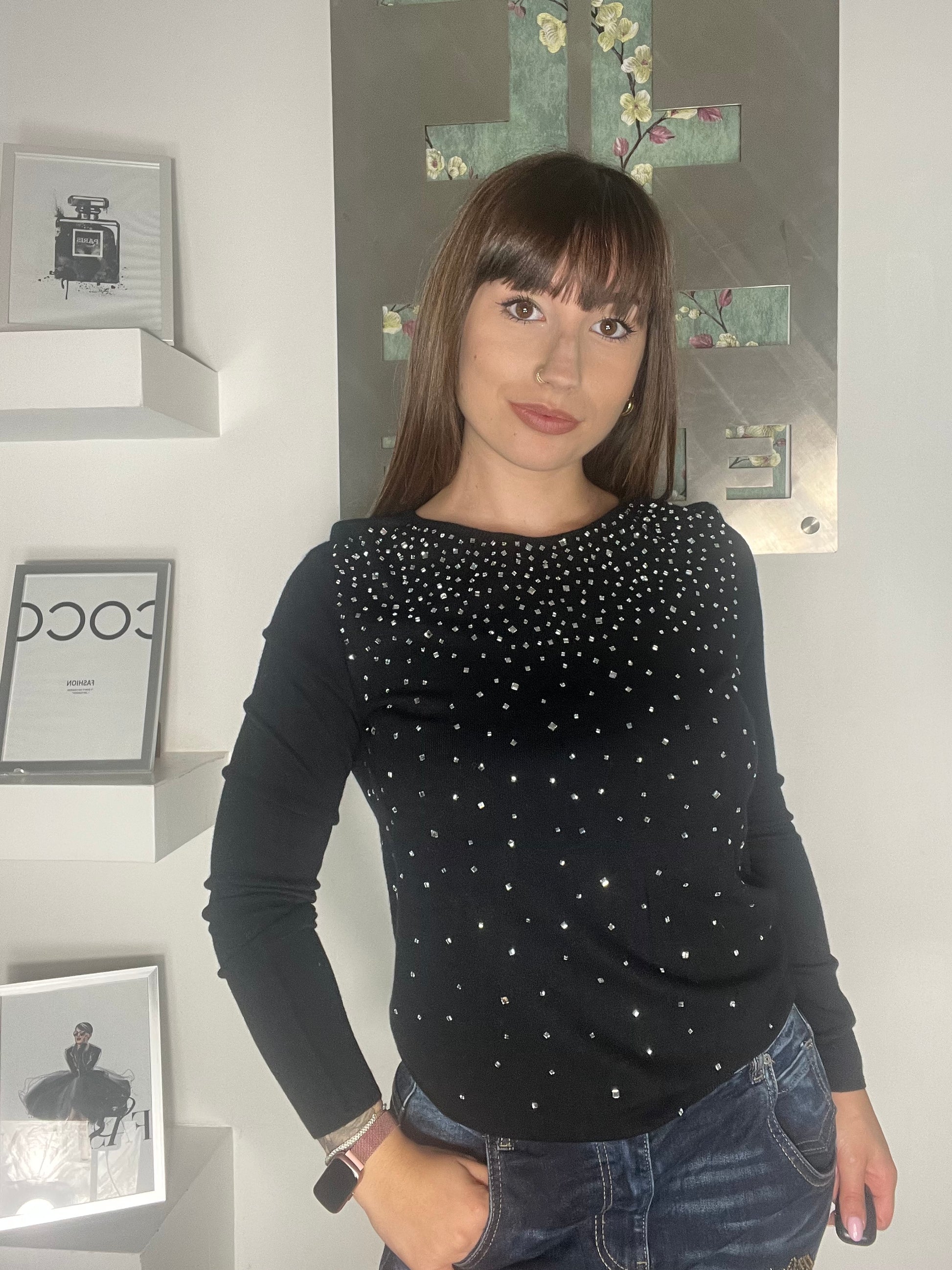 La maglia rasata avvolge con leggerezza, mentre i brillantini sul davanti catturano la luce ad ogni movimento, regalando un tocco di brillante eleganza al tuo look quotidiano.
