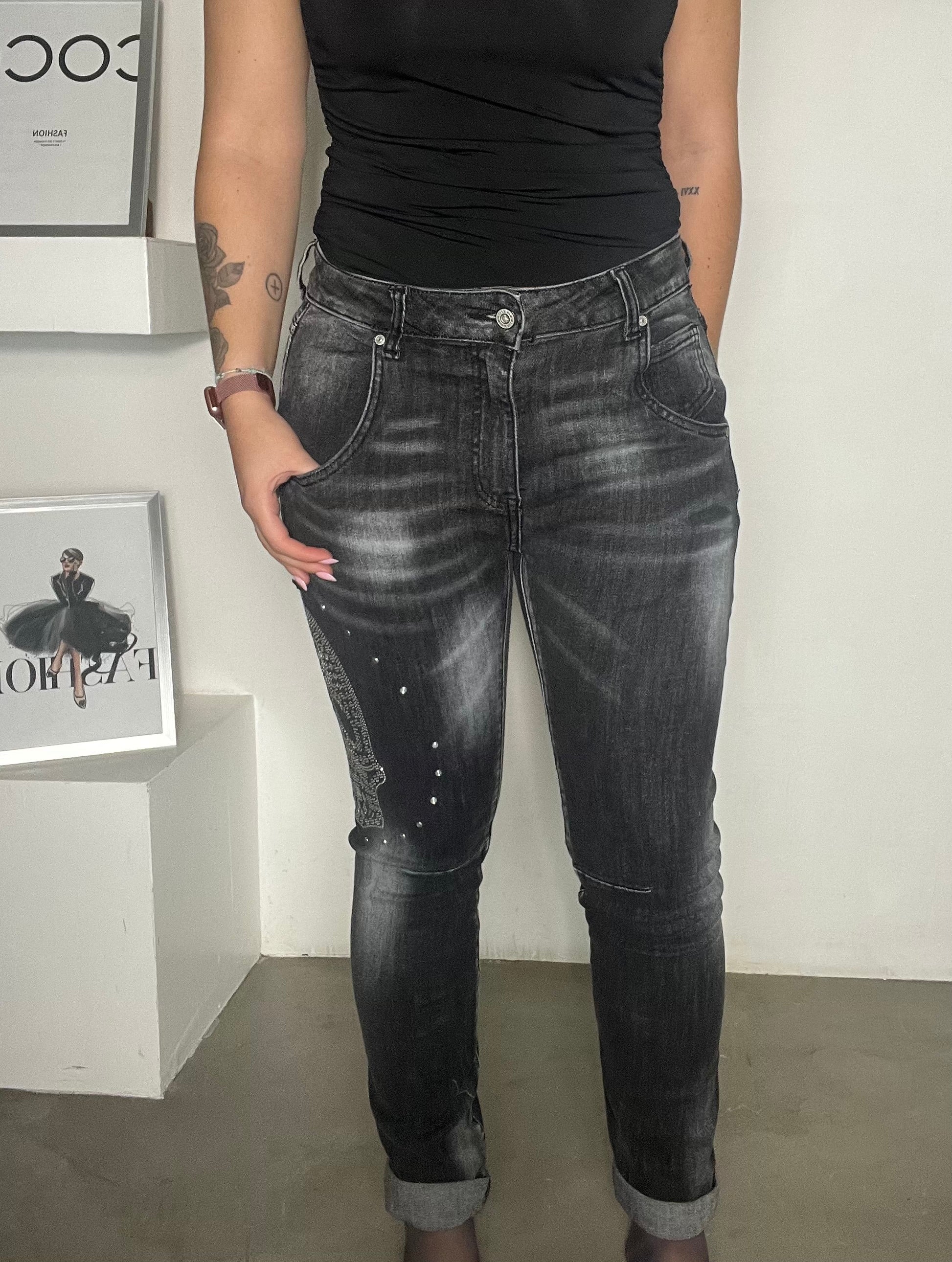 L'applicazione di cristalli sulla gamba disegna un mezzo teschio scintillante, trasformando un capo casual in un vero statement di stile.