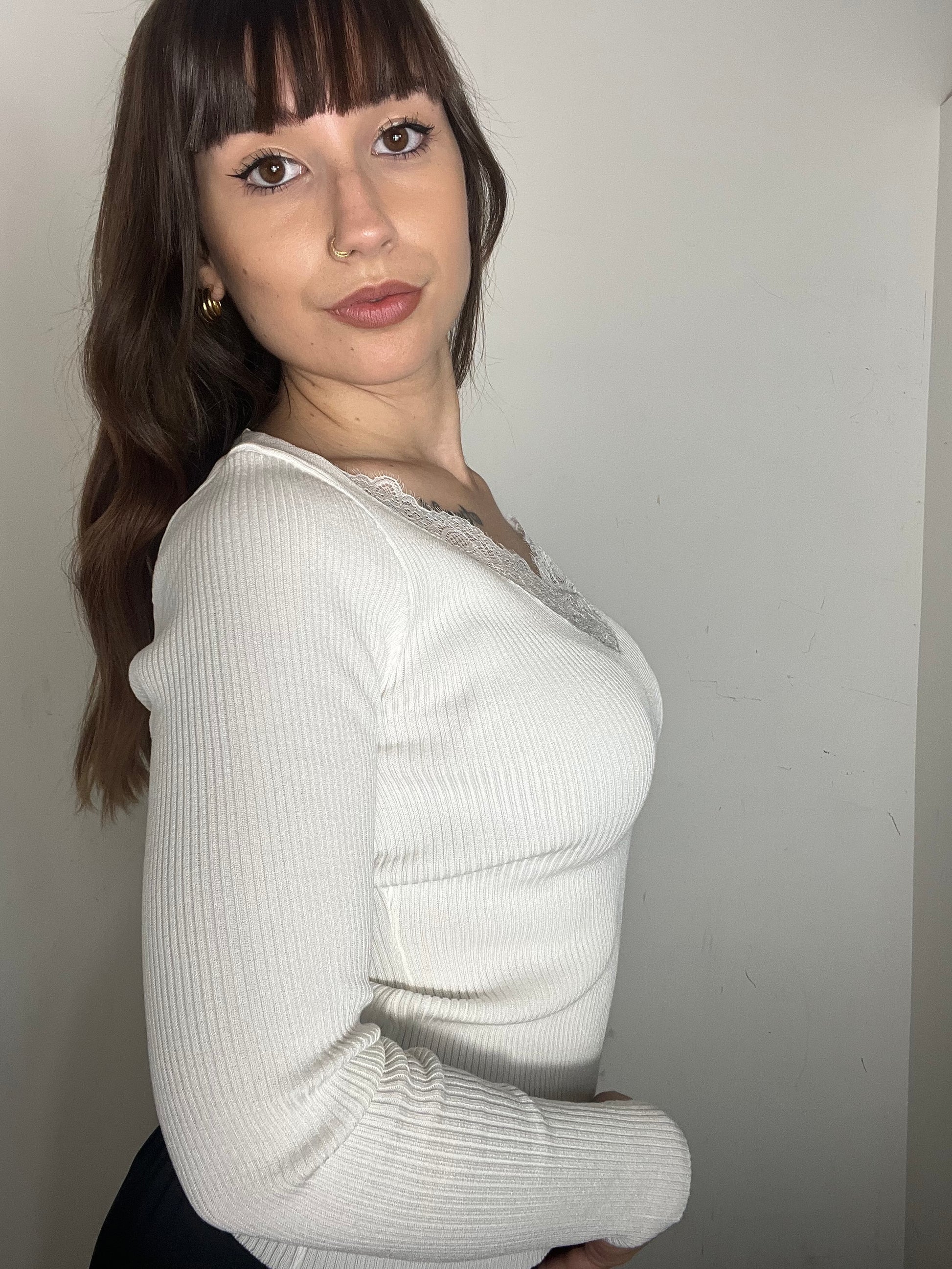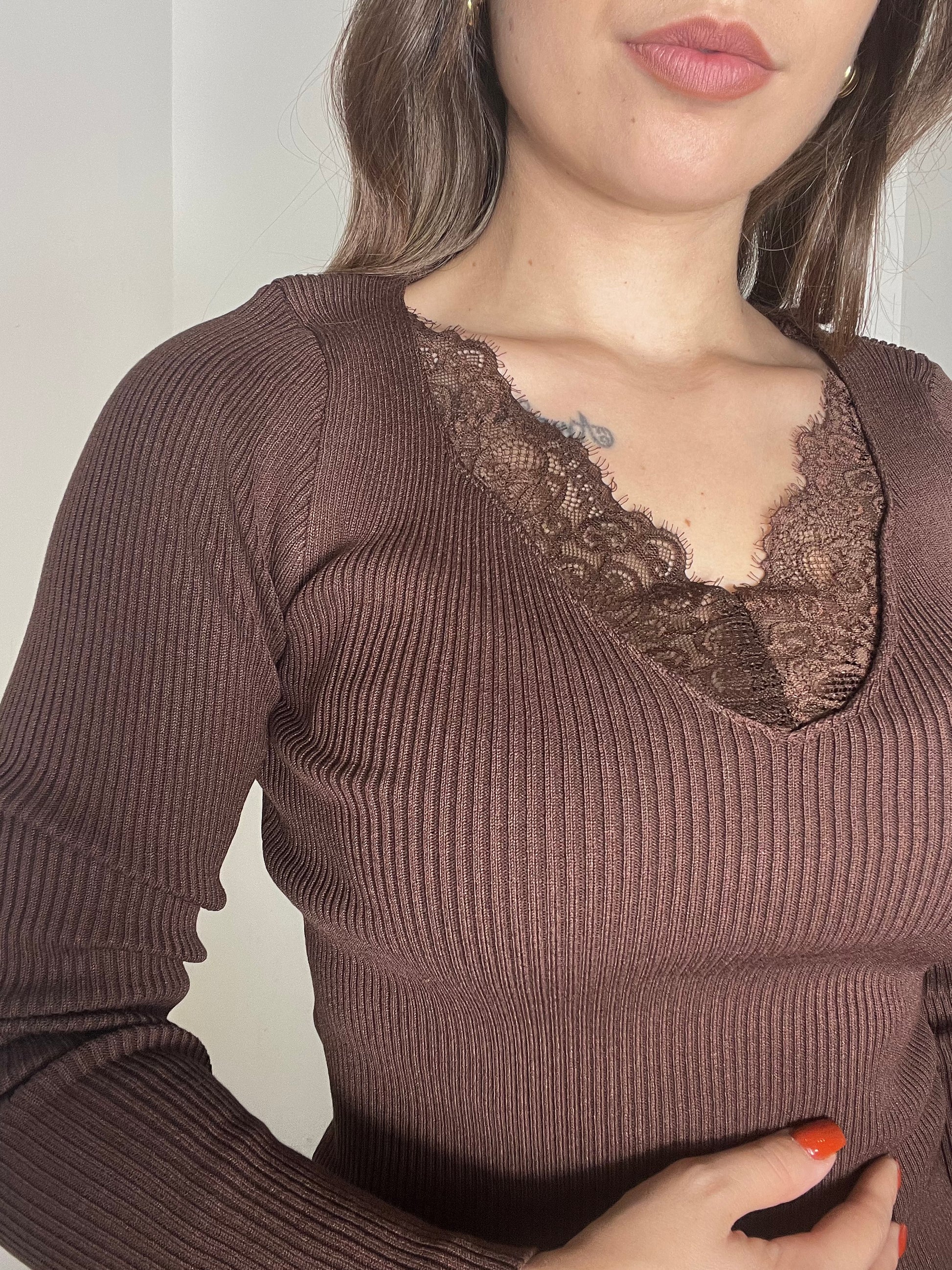 Maglia Federica maglia a costine elasticizzata, pensata per valorizzare le forme con eleganza e confort. Lo sollo è impreziosito da un delicato inserto in pizzo che dona femminilità e un tocco raffinato, perfetta da indossare sia di giorno con un look casual chic, sia la sera abbinata a gonne o pantaloni più eleganti.