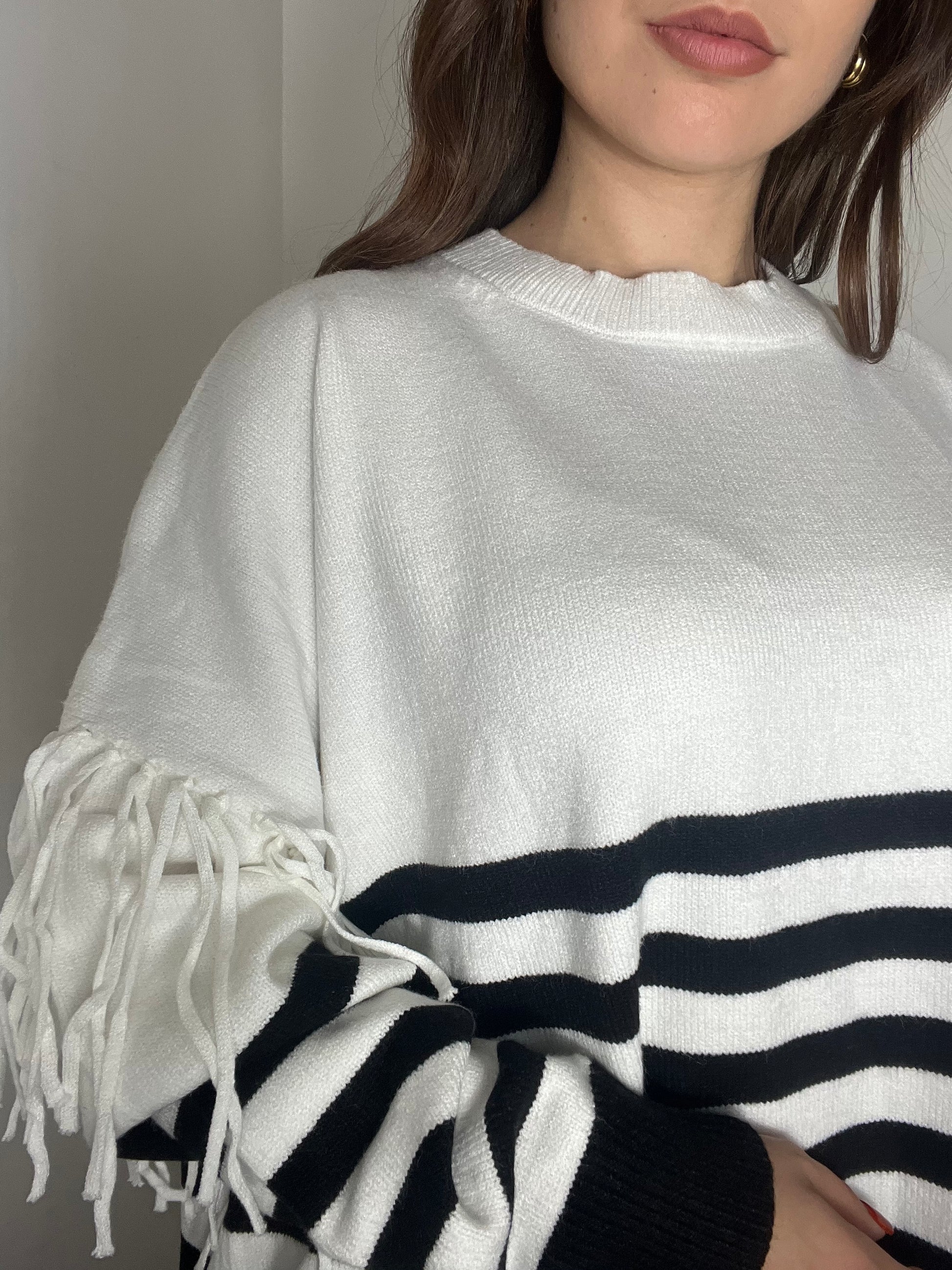 Maglia Francesca maglione morbido con frange sulla manica rigato vestibilita over adatto anche per sdrammatizzare il pantaloncino e giustissimo sul leggins
