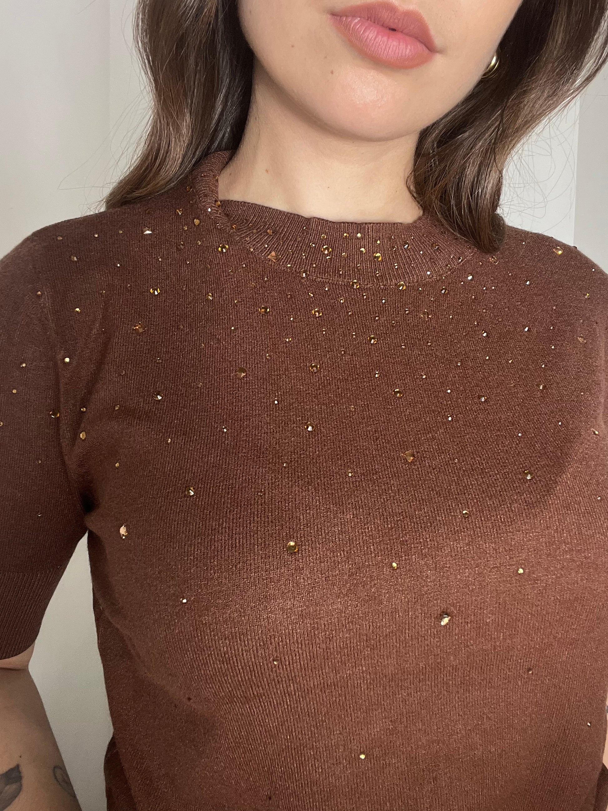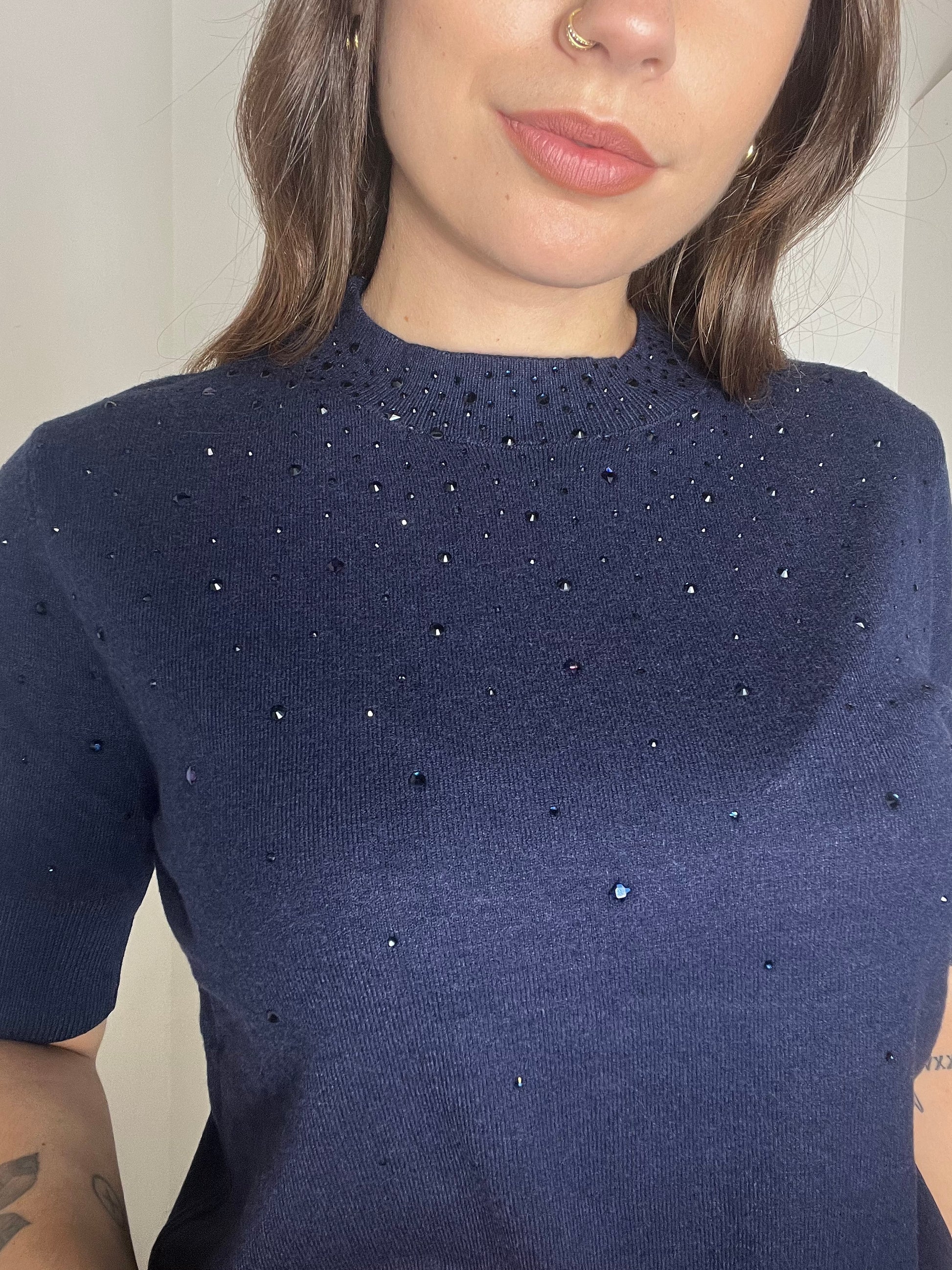 Maglia Maria girocollo in maglia rasata dalla linea essenziale e femminile, impreziosito da delicate applicazioni di cristalli che donano luminosità e raffinatezza. Le maniche corte lo rendono versatile e perfetto da indossare sia con un look casual chic che sotto una giacca elegante per un tocco sofisticato.