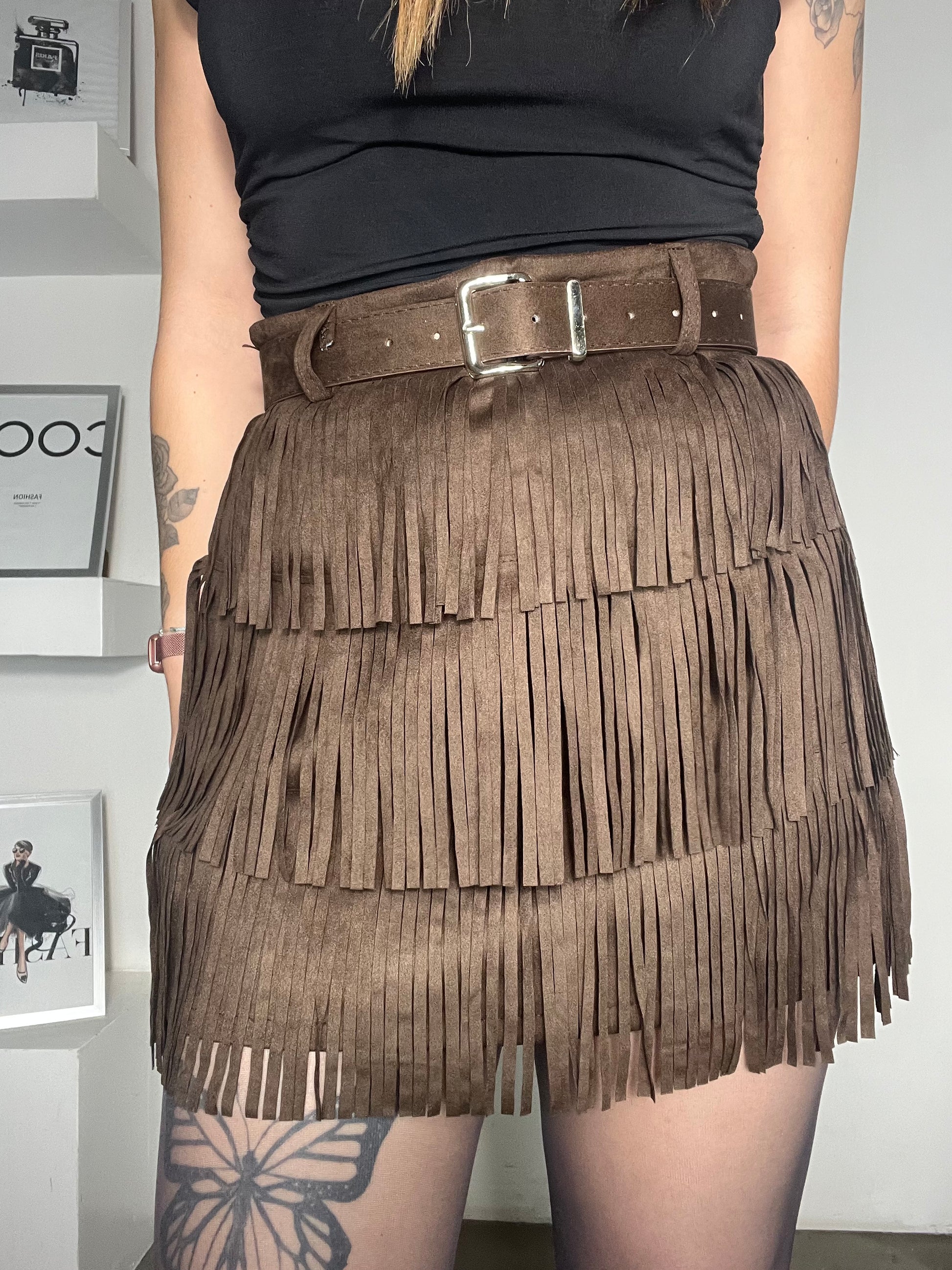Grintosda e supe femminile, questa minigonna in ecopelle con frange e cintura nasconde un comodo shorts interno che la rende pratica ed irresistibile.