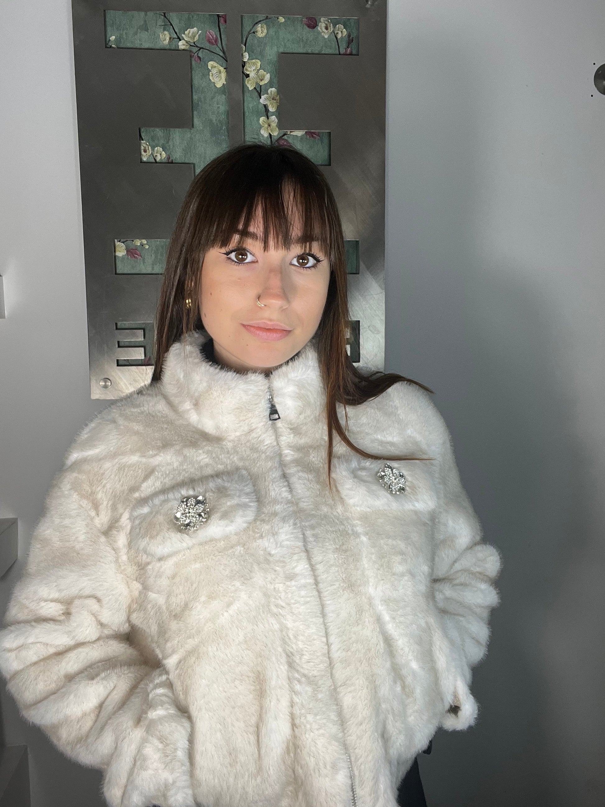 Pelliccia Corta Clara ecopelliccia rasata corta, dal taglio femminile e raffinato. Il colletto a lupetto e la chiusura a zip sul davanti la rendono pratica e moderna, mentre la taschina decorativa è impreziosita da un bottone gioiello ricoperto di cristalli dettaglio che illumina l'intero capo.