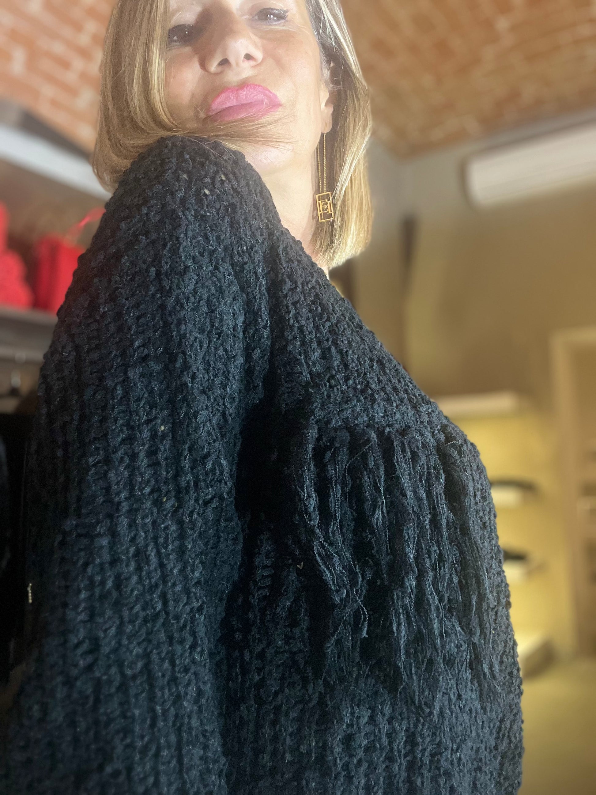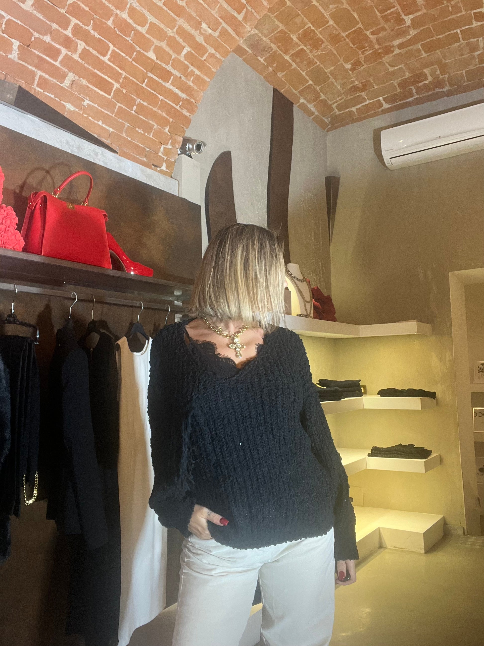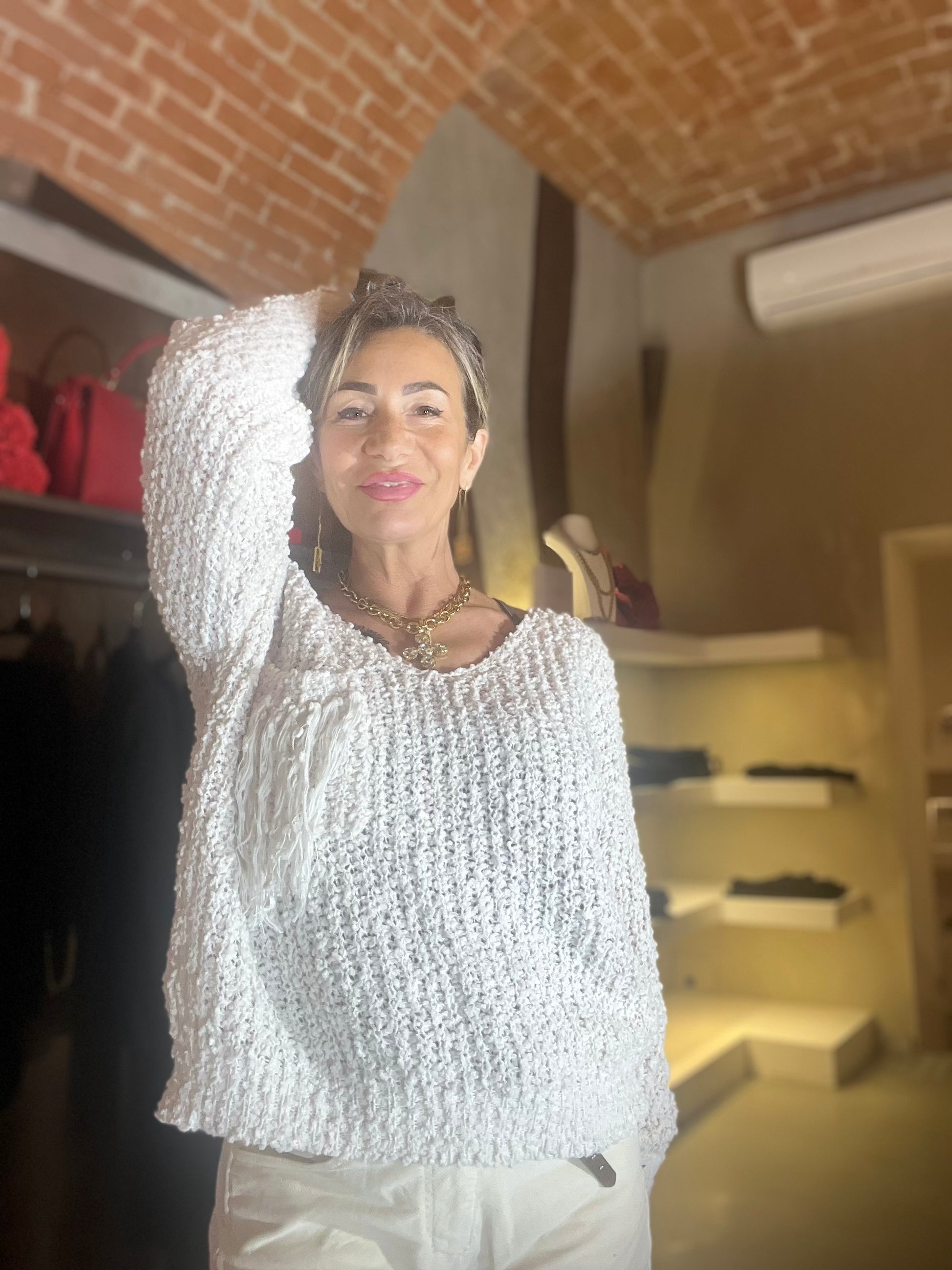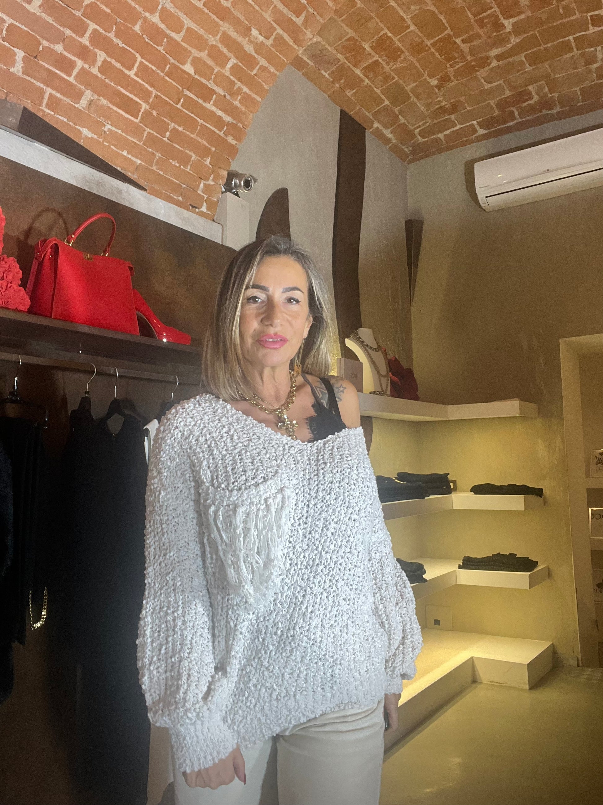 La Maglia Tizzy è il capo versatile che valorizza ogni outfit. Indossala con jeans per un look casual-chic, abbinala a pantaloni eleganti per un ensemble sofisticato, o portala con una gonna per un outfit femminile. Lo scollo a V aggiunge un tocco di eleganza a qualsiasi combinazione.